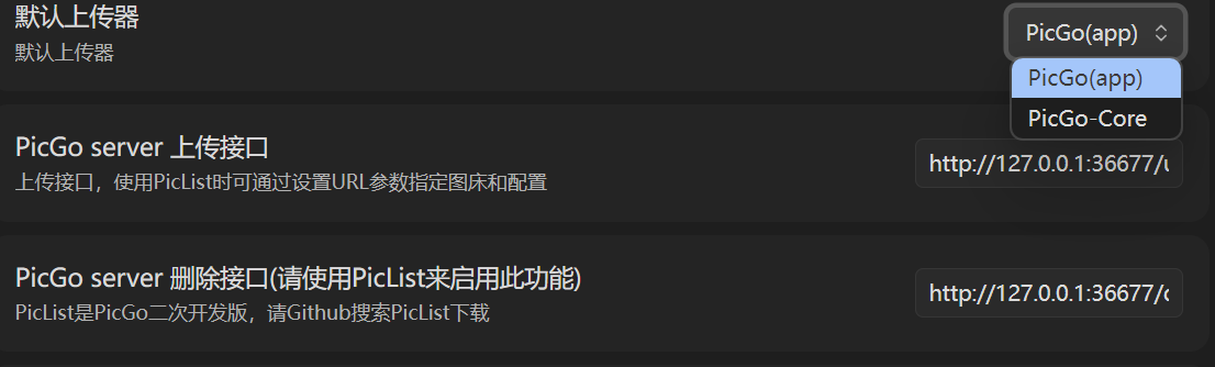 1. 进入image auto upload的设置,勾选剪切板自动上传,默认上传器选择Picgo(app),之后上传接口根据Picgo中设置的端口进行配置。