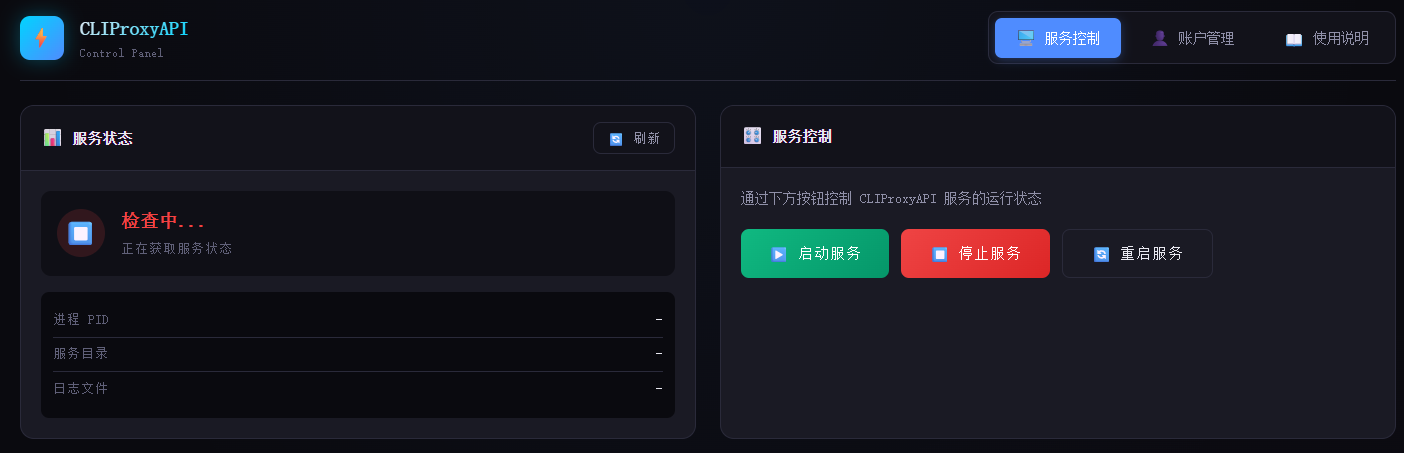| 服务控制 | 查看 CLIProxyAPI 运行状态,启动 / 停止 / 重启服务,查看实时日志 |