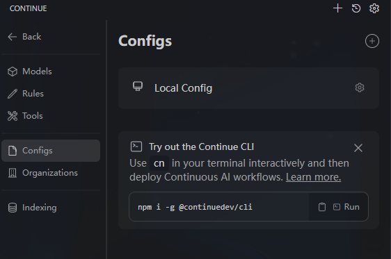 保存后,Continue 面板左侧的报错提示消失,即配置成功。